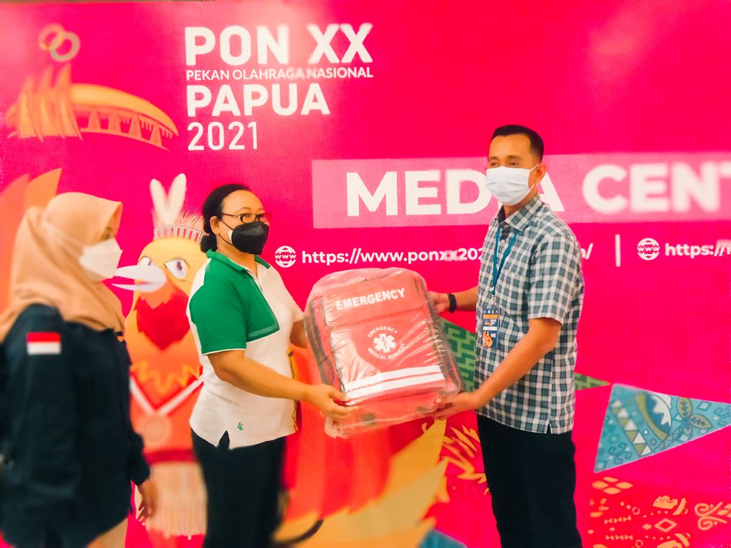 Dukungan Alkes yang diberikan oleh perwakilan Dinkes Jayapura, Yacoba B, diterima oleh Koordinator Sekretariat Media Center Kominfo PON Papua Klaster Jayapura, Very Radian Wicaksono di Jayapura, Selasa (21/9/2021).