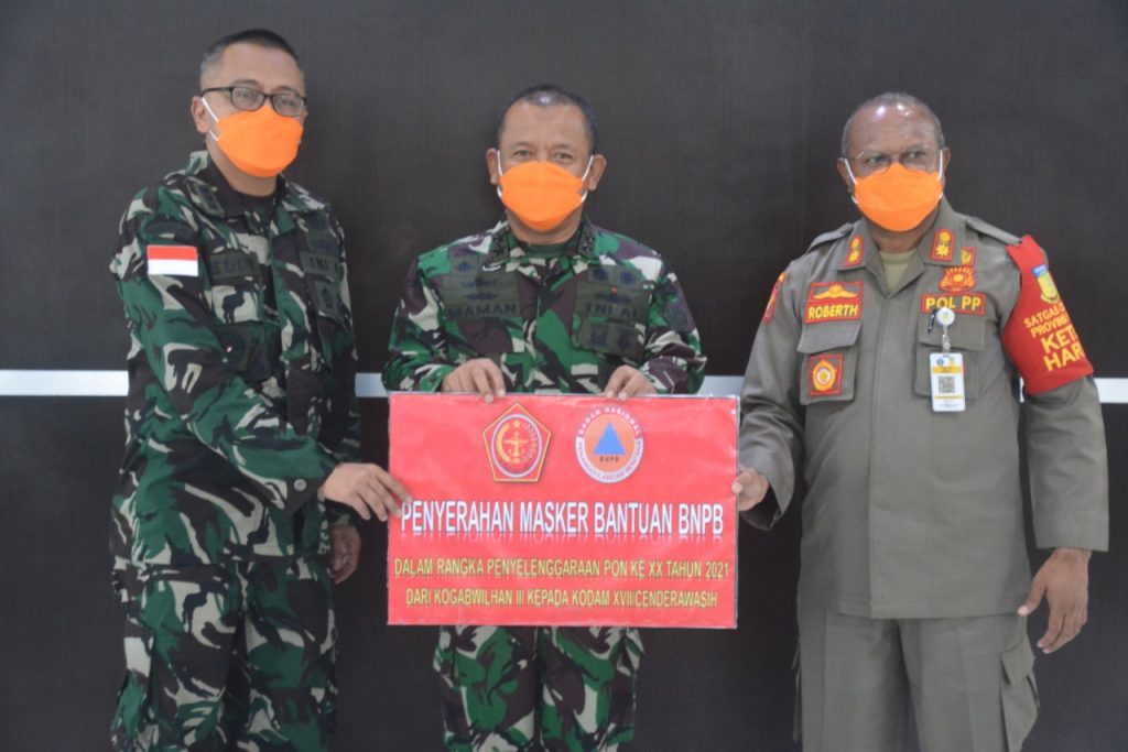 Kogabwilhan III menyerahkan dua juta masker bantuan dari BNPB kepada penonton PON XX/2021 Papua di Kota Jayapura, Kabupaten Jayapura, Kabupaten Mimika dan Kabupaten Merauke, melalui Kodam XVII/Cenderawasih.