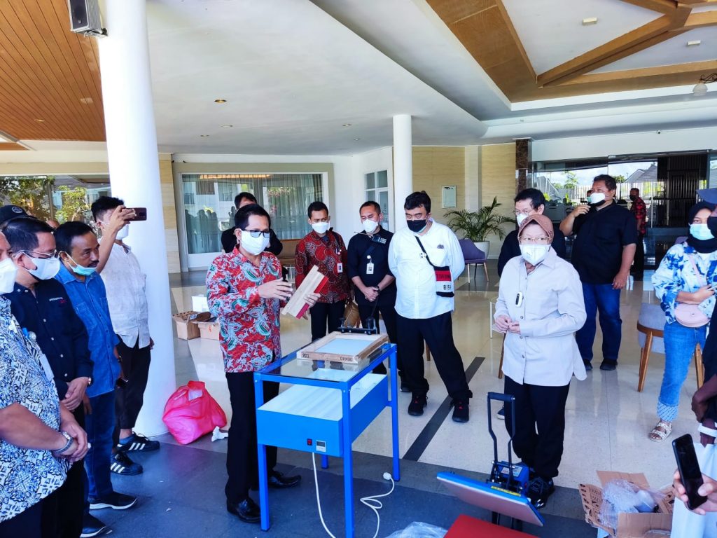 Mensos Tri Rismaharini, menyerahkan bantuan satu paket peralatan sablon kepada Komunitas Creative Digital Papua (CDP) di Hotel Suni Garden Lake, Sentani, dalam kunjungan kerja hari kedua di Jayapura, Minggu (8/8/2021).