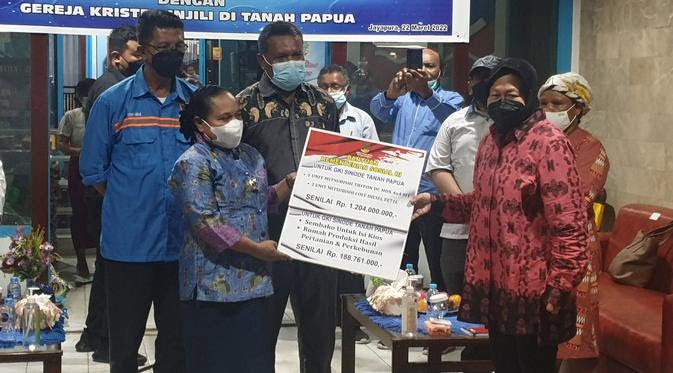 Menteri Sosial Tri Rismaharini menyalurkan sejumlah bantuan berbentuk fasilitas pemberdayaan ekonomi untuk Gereja Kristen Injili (GKI) di Tanah Papua. Adapun nilainya sebesar Rp 1,3 miliar.