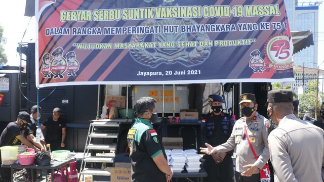 Dapur umum Brimob Polda Papua menyiapkan nasi goreng dengan topping seafood, untuk warga di Kota Jayapura usai menerima vaksin COVID-19.Nasi goreng sengaja dihadirkan untuk menambah energi dan semangat bagi warga setempat. Wakapolda Papua, Brigjen Pol Eko Rudi Sudarto yang melihat langsung pelaksanaan vaksinasi massal menyebutkan Satuan Brimob Polda Papua sengaja menyiapkan nasi goreng yang langsung dimasak oleh personel Brimob Papua. “Kami harapkan menu nasi goreng yang diberikan dapat menambah energi dan semangat warga usai divaksin,” katanya.