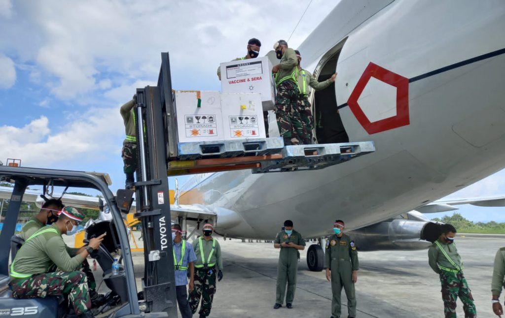 485.200 dosis vaksin Covid 19 yang akan didistribusikan di wilayah Papua, tiba di Bandara Sentani, dan langsung dibawa ke Base Ops Lanud Silas Papare, Senin (16/8/2021).