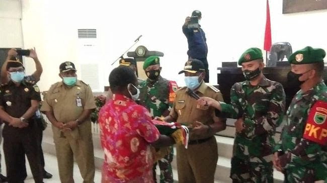 “Saat acara tambahan dilaksanakan penyerahan bendera Bintang Kejora dari salah satu warga binaan Koramil 1806-03/Merdey Kampung Meyom saudara Yunias Menti,” ujar Danrem 182/JO Kolonel Inf Yudha Medy Dharma Zafrul dalam keterangan tertulis Pendam XVIII/Kasuari, Selasa (15/6/2021).