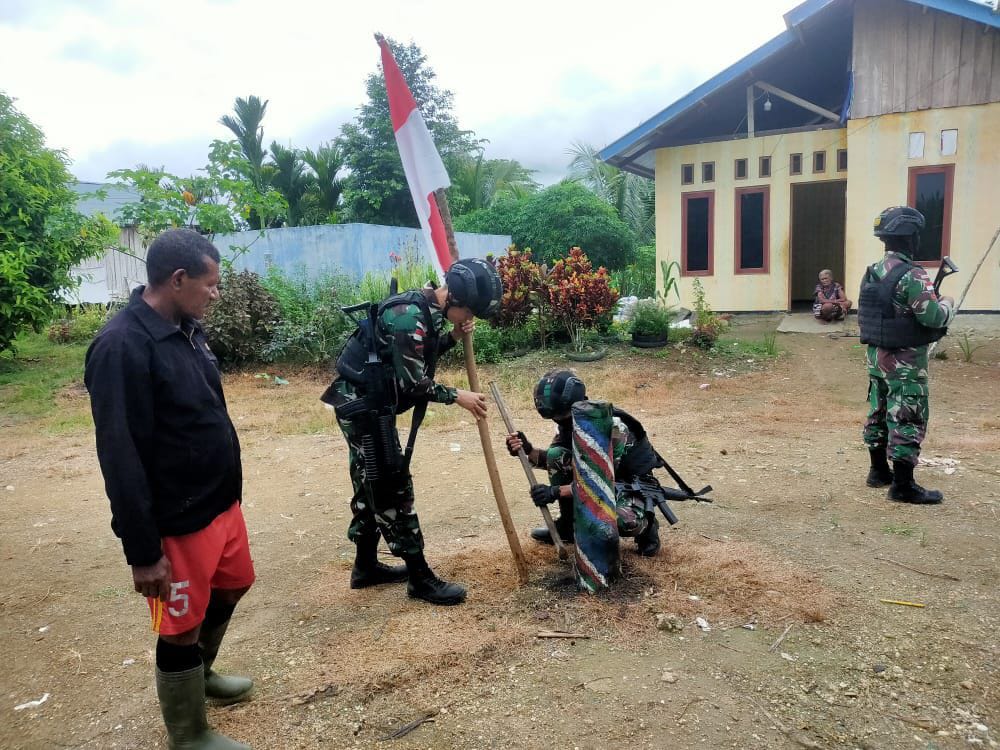 Dalam rangka memperingati HUT RI ke-76 personel TNI Satgas Pamtas RI-PNG Yonif 131/Brs gelar kegiatan bhakti sosial dan mengibarkan Bendera Merah Putih, berlokasi di Kampung Arso 7 sampai dengan Kampung Yowong RT 1 dan RT 2, Distrik Arso Barat Kab. Keerom, Papua, Kamis (12/08/2021)