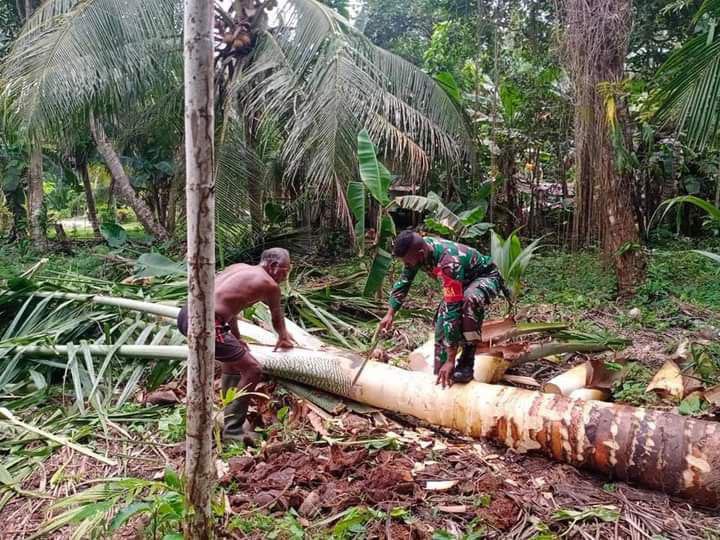 Memupuk kebersamaan dan keharmonisan bersama masyarakat, Sertu Melkianus Nap Babinsa Posramil 1708-02/Bu-Warsa melaksanakan komunikasi sosial dengan membantu secara langsung proses pengolahan sagu milik masyarakat di Kampung Karmon, Distrik Yawosi, Kabupaten Biak Numfor, Selasa (31/8/2021).