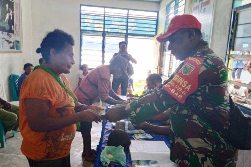 Prajurit TNI Babinsa Kodim 1709/Yawa Serka Jekson R. Horota mengawal dan mendampingi penyaluran Bantuan Langsung Tunai Dana Desa 2021 kepada masyarakat Kampung Rembai, Distrik Wonawa, Kabupaten Kepulauan Yapen, Papua dalam upaya menjamin penyaluran bansos secara tepat sasaran.