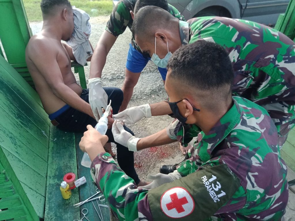 Satgas Pamtas RI-PNG Yonif 131/Brs memberikan pengobatan kepada warga yang mengalami luka robek di bagian tangan kanan, akibat kecelakaan kerja di Perbatasan RI-Papua New Guinea (PNG) tepatnya di Kampung Nafri, Distrik Abepura, Kota Jayapura, Papua, Senin (23/8/2021).