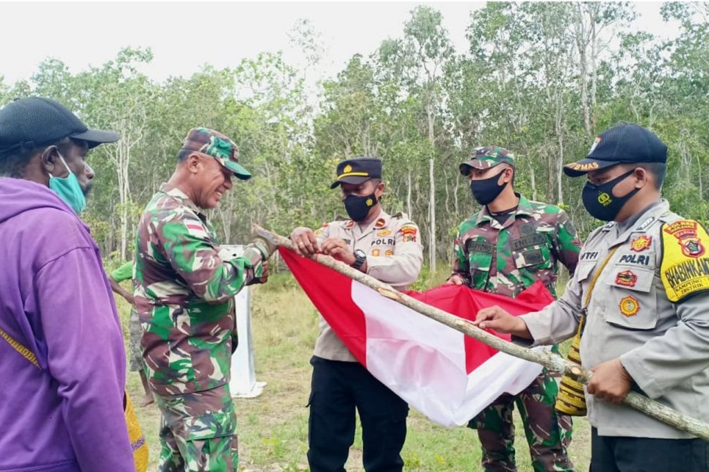 TNI/Polri bersama tokoh masyarakat mengibarkan bendera merah putih menyambut HUT RI ke-67 patok MM 13.2 Perbatasan RI-Papua New Guinea (PNG), Kampung Rawa Biru, Distrik Sota, Kabupaten Merauke, Papua, Jumat (13/8/2021).