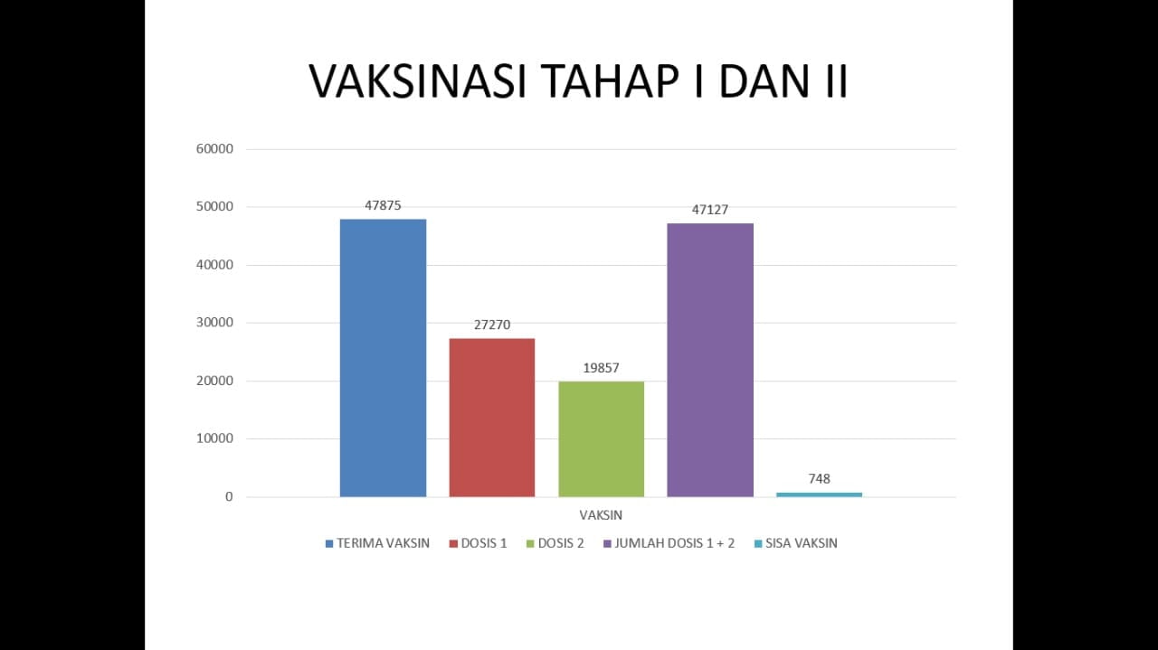 Dengan rincian, untuk tetes dosis pertama sebanyak 27.270 orang, tetes dosis kedua 19.857 orang. Sisa vaksin 748 dosis dari yang diterima sebanyak 47.875 dosis.