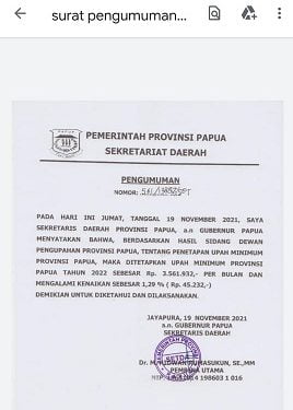 Pemerintah Provinsi (Pemprov) Papua menyampaikan Pengumuman No.561/13887/SET tentang Upah Minimum Provinsi (UMP) Provinsi Papua tahun 2022.