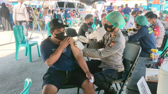 Vaksinasi merdeka menyasar warga di pemukiman padat penduduk yang juga berdekatan dengan Pasar tradisional Hamadi di Kota Jayapura.Pelaksanaan vaksin dilakukan di Hamadi Mako Polair Polresta Jayapura Kota dengan menggandeng Biddokkes Polda Papua dan puskesmas setempat. Paurkes Kamtibmas Subbid Dokpol Biddokkes Polda Papua Iptu Fajar menjelaskan terdapat 30-an staf dan tenaga kesehatan yang membantu vaksinasi. “Gerai vaksin digelar untuk mendukung program pemerintah dalam mempercepat herd immunity di tengah pandemi COVID-19 saat ini. Vaksin ini diberikan gratis,” jelasnya, Rabu (18/8).