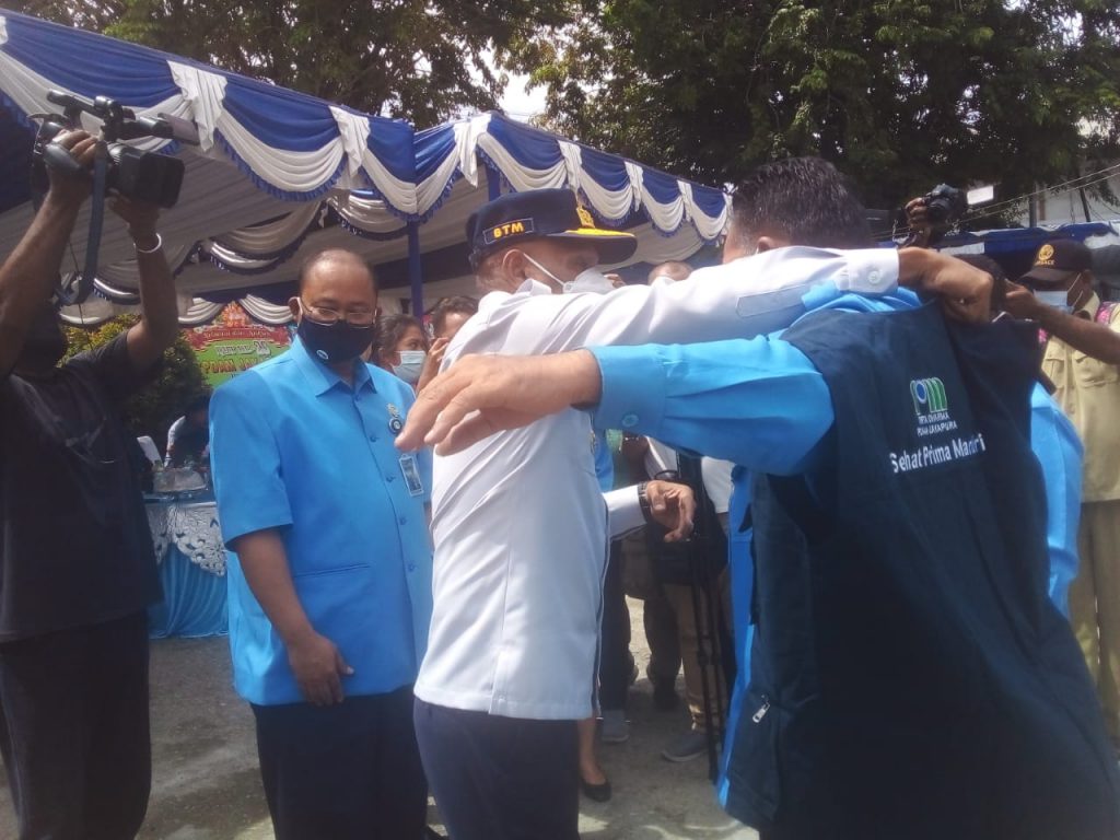 Walikota Jayapura Benhur Tomi Mano, didampingi Dirut PDAM Jayapura Entis Sutisna, melaunching Satgas PON XX dan Peparnas XVI, khusus untuk pelayanan air bersih di Kantor PDAM Jayapura, Jalan Baru Kelapa Dua, Entrop, Senin (21/6/2021).